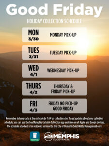 MEMPHIS, Tenn.— March 13, 2026— In observance of Good Friday, City of Memphis government offices will be closed on Friday, April 3, 2026. Residents serviced by the City of Memphis Solid Waste Management will not receive trash collection on this day. Customers with regular collection Monday through Thursday should place their carts out on their normal service day, while Friday customers will have collection moved to Thursday, April 2.
