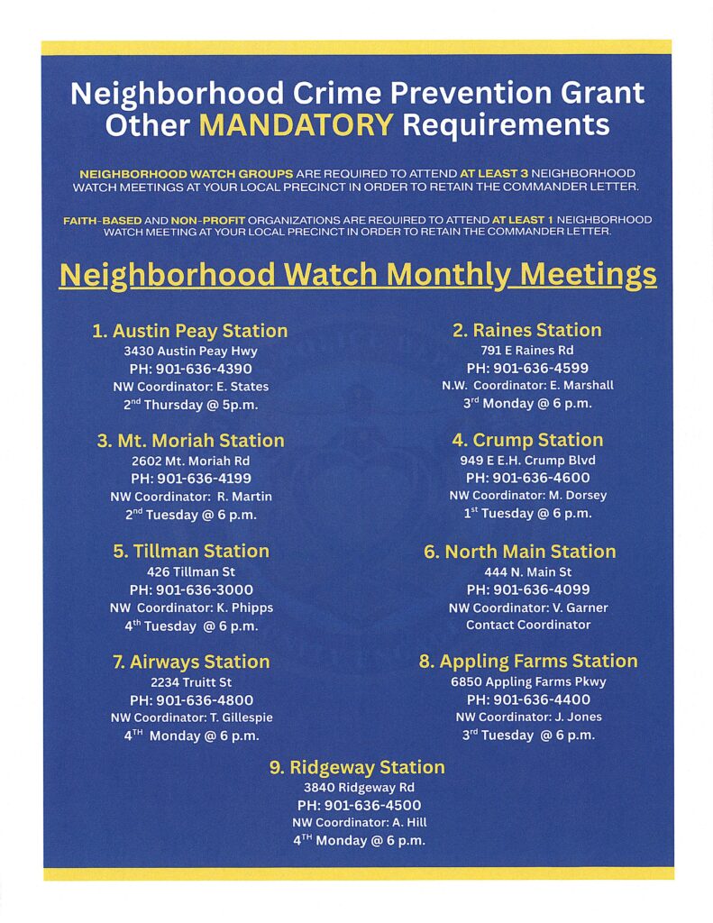 Our Mission: The Memphis Area Neighborhood Watch office works to bring the entire neighborhood together to help fight crime. Partnerships are built between our office, other City Divisions, neighborhood groups, faith-based organizations, and community agencies.